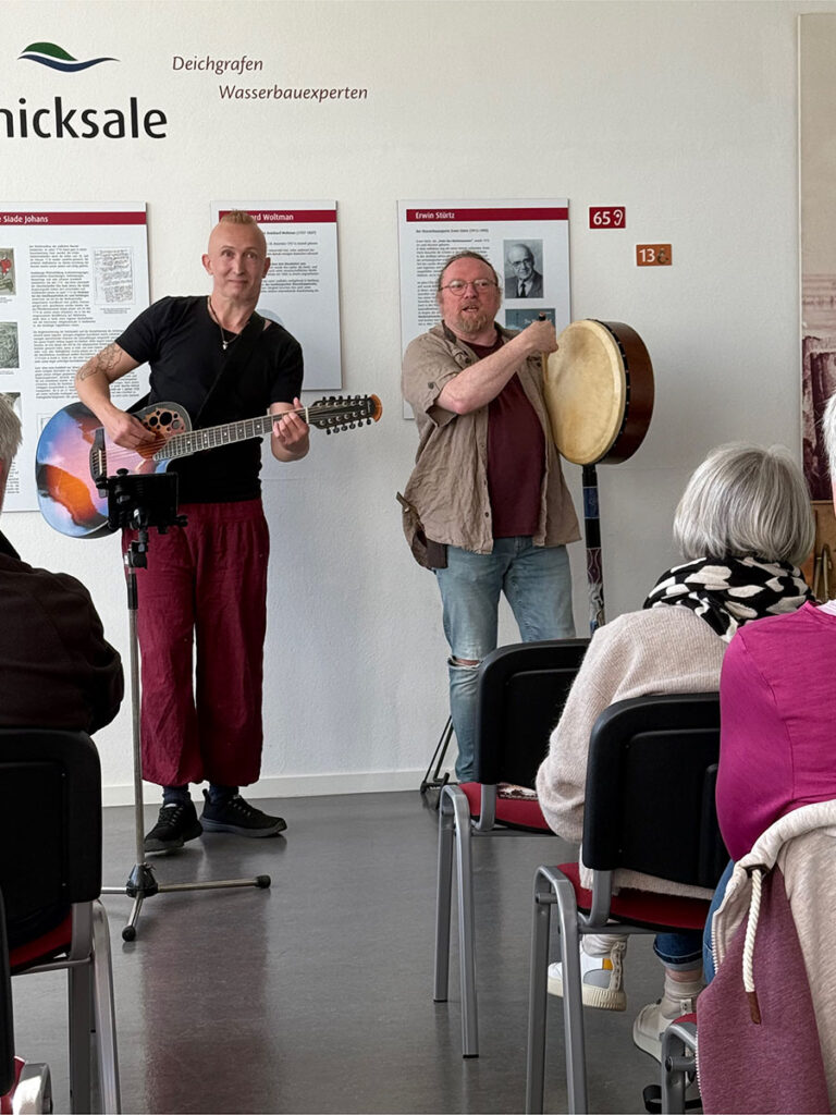 Auf außergewöhnlichen Instrumenten präsentierten Marcus Friedeberg und Marco Neumann folkige und weltmusikalische Musikstücke – gepaart mit humorvollen Beiträgen.