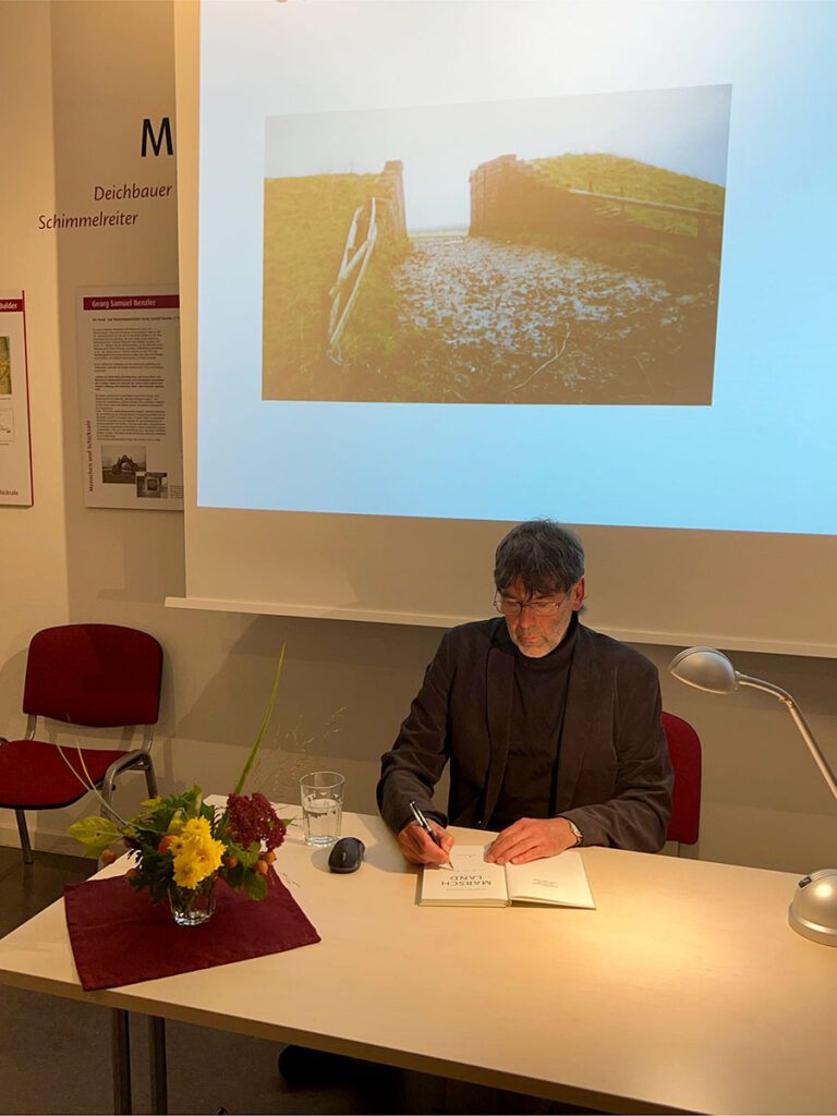 Der Kulturwissenschaftler Norbert Fischer ist fasziniert von dem fruchtbaren „MARSCHLAND“ an der Grenze zwischen Wildnis und Zivilisation. Es handelt sich um ein bedrohtes Land, immer wieder erobert sich das Meer zeitweilig ein Stück zurück und hinterlässt dabei seine Spuren. Diese Faszination hat Prof. Norbert Fischer in seinem Buch „MARSCHLAND“ anschaulich dargestellt und in seiner Lesung im Oktober 2024 den Gästen im Deichmuseum Land Wursten begeistert vermittelt.